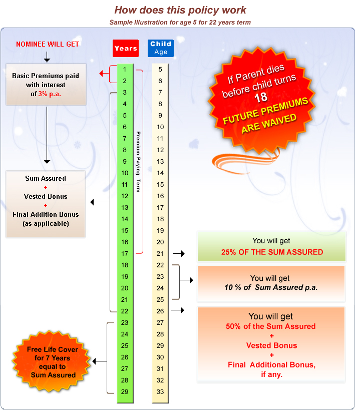 - Premium Waiver Benefit: All balance premiums waived if parent dies before the premium paying term