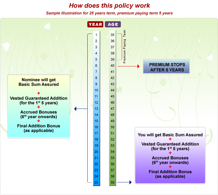 • Life Cover from 6th year onwards: Sum Assured +Guaranteed Additions for the 1st 5 years + Accrued bonuses declared from 6th year onwards + Final Addition Bonus (as applicable)