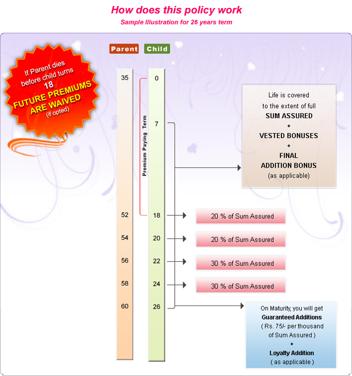 • Life Cover: Full Sum Assured + Bonus + Final Addition Bonus (as applicable) even if survival benefits have already been paid as money back. Life cover starts at age 7 or 2 years from date of commencement whichever is later