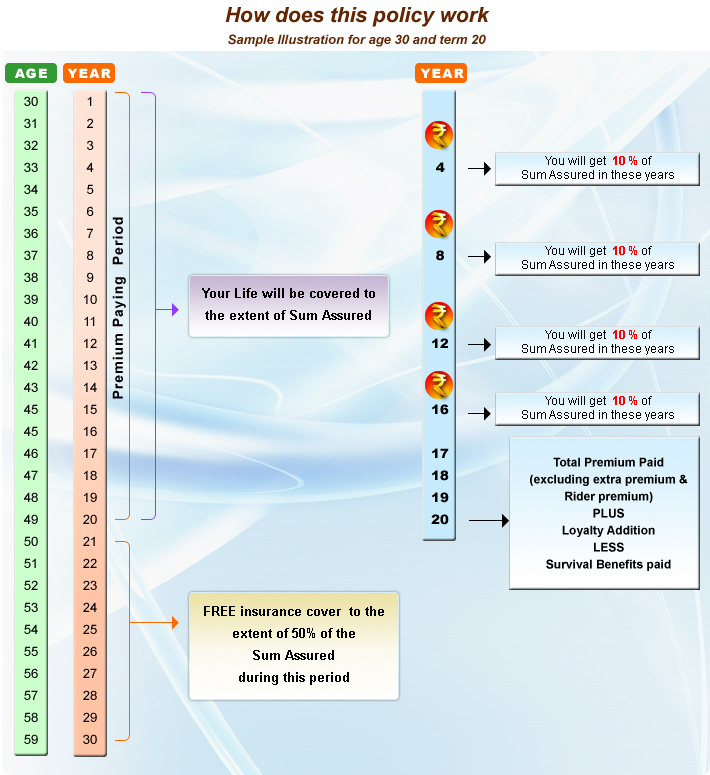 Available in 12, 16 or 20 years term with money back installments every 4 years